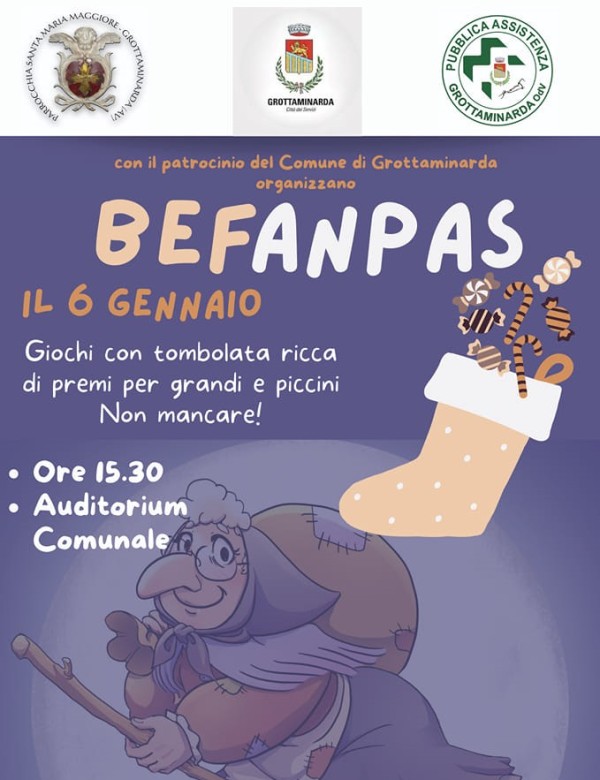 La Pubblica Assistenza Grottaminarda Odv, con il patrocinato del Comune di Grottaminarda e insieme alla Parrocchia di Santa Maria Maggiore, organizza un pomeriggio di giochi e tombolate ricche di premi per grandi e piccini.L’evento avrà luogo domani 6 Gennaio, presso l’Auditorium Comunale, alle ore 15.30, chiudendo così il ricco cartellone “Natale Insieme” che dal 19 novembre, con la collaborazione di diverse associazioni, ha reso più belle le feste con tanti momenti di intrattenimento per ogni target di età, creando occasioni per stare insieme e condividere musica, giochi, degustazioni, falò, beneficenza e momenti di riflessione religiosa.