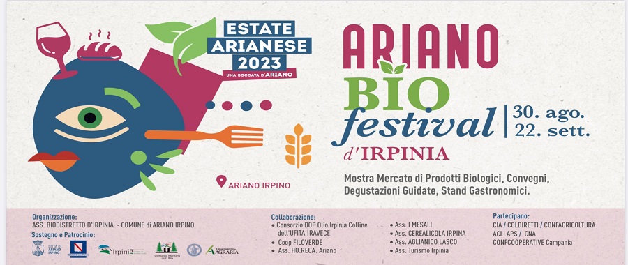 Ad Ariano Irpino si alza il sipario sull’Ariano Bio Festival d’Irpinia, un percorso conoscitivo e di confronto tra addetti ai lavori e territorio nella sua complessità, che avrà luogo ad Ariano Irpino dal 30 Agosto al 22 Settembre. La mostra mercato di prodotti biologici, convegni, degustazioni guidate e stand gastronomici accenderanno i riflettori sulle risorse e le tipicità agroalimentari del posto. L’obiettivo del Comune di Ariano Irpino, e di un ampio e variegato partenariato associativo, è quello di far conoscere quanto di buono il territorio irpino può offrire. Senza trascurare l’incentivo a consumare prodotti derivanti da agricoltura sostenibile.